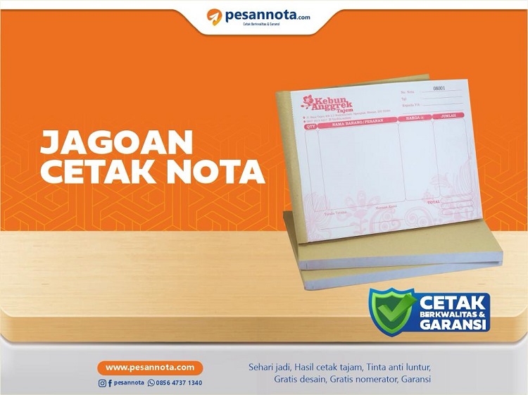 Untuk memastikan bisnis Anda memiliki bukti transaksi yang sah, pastikan untuk cetak nota, kwitansi, maupun faktur di Pesannota.com! Dengan layanan profesional dan cetak berkualitas, kami akan membantu memenuhi kebutuhan cetak nota Anda. Pesan dan custom nota bisnis Anda sekarang juga kepada kami!